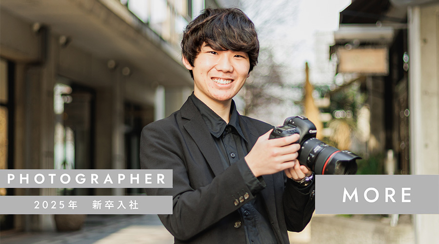 同期はブライダルやカメラの専門学校を卒業していて、もともとの知識量の差に直面しました。その差を埋めるために勉強と実践を繰り返し、少しずつですが自信を持って仕事を進められるようになってきています。今は結婚式の撮影がとても楽しいです。新郎新婦の幸せな表情、家族や友人の温かい雰囲気を写真に収めることは非常にやりがいがあります。結婚式という人生の大切な一瞬に携わることができ、人々の記憶に残る価値のある瞬間を捉えることができる。このことに喜びと同時に責任を感じています。また、会社の雰囲気がとてもよく、社員同士のコミュニケーションも活発です。全員が高い向上心を持っており、スキルアップのために勉強会やプレビュー会などが頻繁に開催され自己成長に繋がる環境が整っています。毎日の業務が非常に快適で、入社前とのギャップはありませんでした。