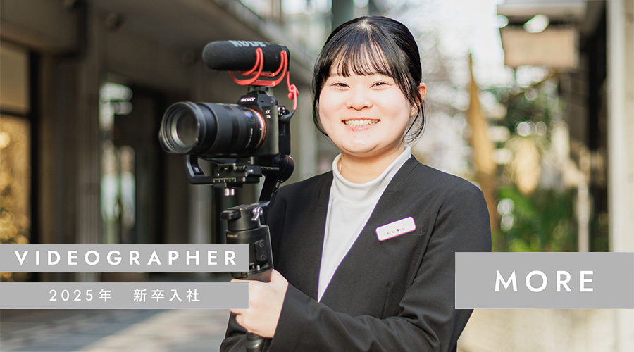 一組一組に寄り添い、「あなたにお願いして良かった!」と思ってもらえるようなビデオグラファーになりたいです。そのために、とにかく先輩方からいろんなことを吸収しようと毎日勉強中。撮影に関する知識、映像制作に対する思い、どんなことに気をつけて撮影しているかなど、ブライダルビデオグラファーとして大切にするべきことはどんな細かいことでも積極的に吸収する努力をしています。未経験だからこそ、経験する全てが新鮮で刺激的で、入社前は「私でも大丈夫かな?」という不安な気持ちでいっぱいでしたが、今はチャレンジしてみて良かったと思っています。先輩方は忙しい中でも親切に教えてくださるので、ゼロからのスタートでもここまで成長することができました。これからは先輩方のお役に立てるよう、そして後輩のみなさんには今まで教えていただいたことを伝えられるよう頑張っていきたいと思います。